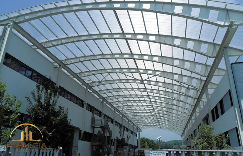 Trong nhà ở dân dụng, vật liệu này thường được sử dụng cho giếng trời, mái che sân thượng hoặc ban công để tận dụng ánh sáng tự nhiên mà không làm tăng nhiệt. Trong công trình thương mại, Polycarbonate được ứng dụng cho mái che lối đi, không gian ngoài trời hoặc khu vực mở, giúp giảm phụ thuộc vào hệ thống chiếu sáng ban ngày. Đối với nhà xưởng và công trình công nghiệp, việc sử dụng tấm lợp lấy sáng xen kẽ giúp giảm đáng kể chi phí điện cho chiếu sáng diện tích lớn – một trong những khoản chi phí vận hành lớn nhất.